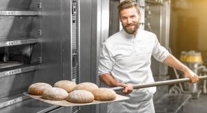 Handsome baker in uniform taking out with shovel freshly baked buckweat bread from the oven at the manufacturing