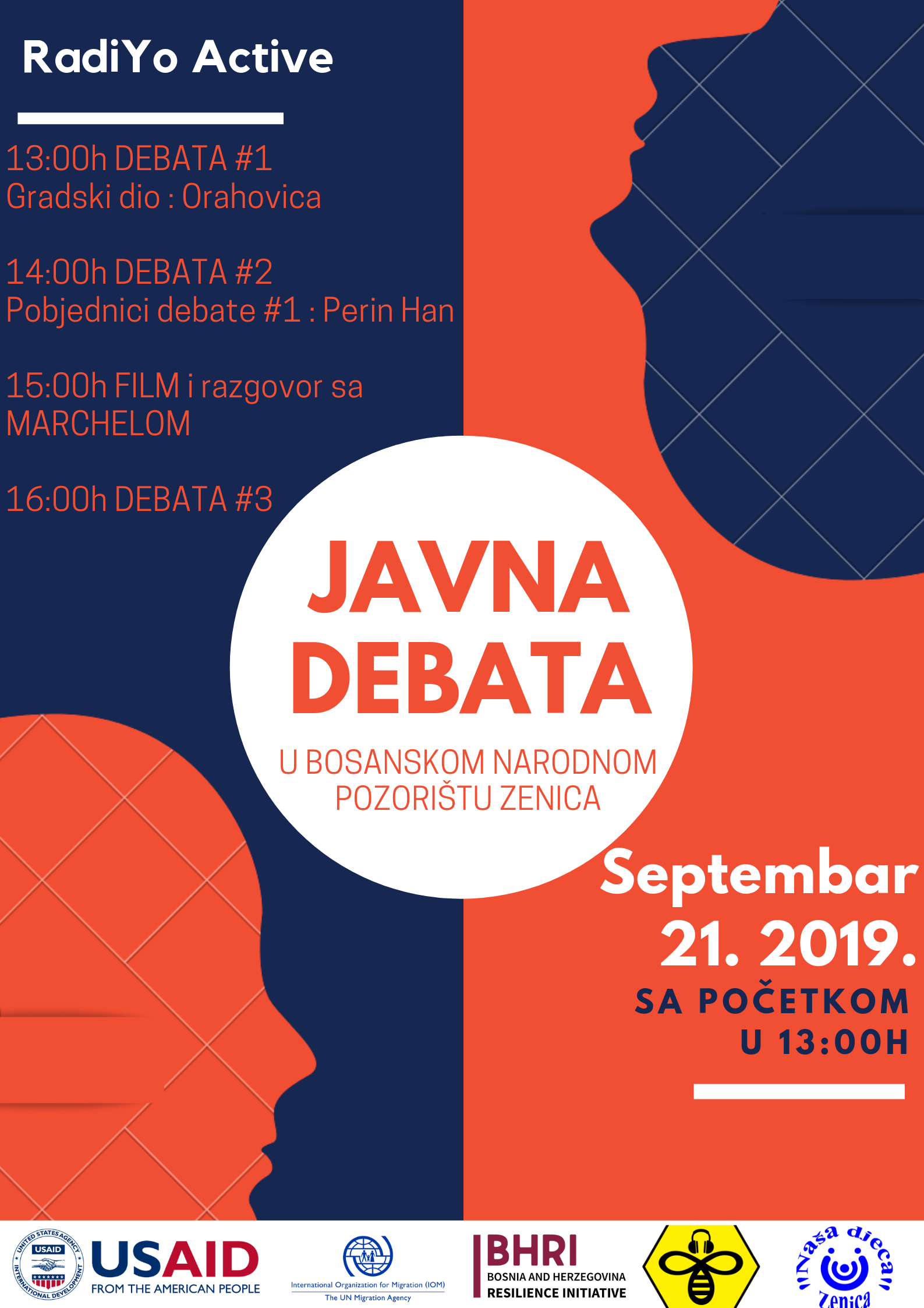 Nakon 5 mjeseci održavanja radionica debate i radio novinarstva, te javnih debata održanih u mjesnim zajednicama, 21. 09. na Maloj sceni Bosansko narodnog pozorišta od 13:00h, biće održana javna debata svih učesnika iz ovih timova. Ova aktivnost je podržana kroz BHRI (Bosnia and Herzegovina Resilience Initiative) projekat.