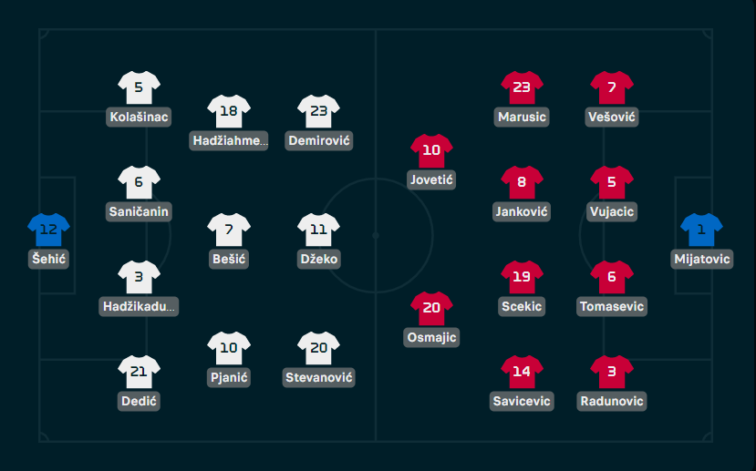 Šehić, Dedić, Saničanin, Hadžikadunić, Kolašinac, Pjanić, Bešić, Hadžiahmetović, Stevanović, Demirović i Džeko.