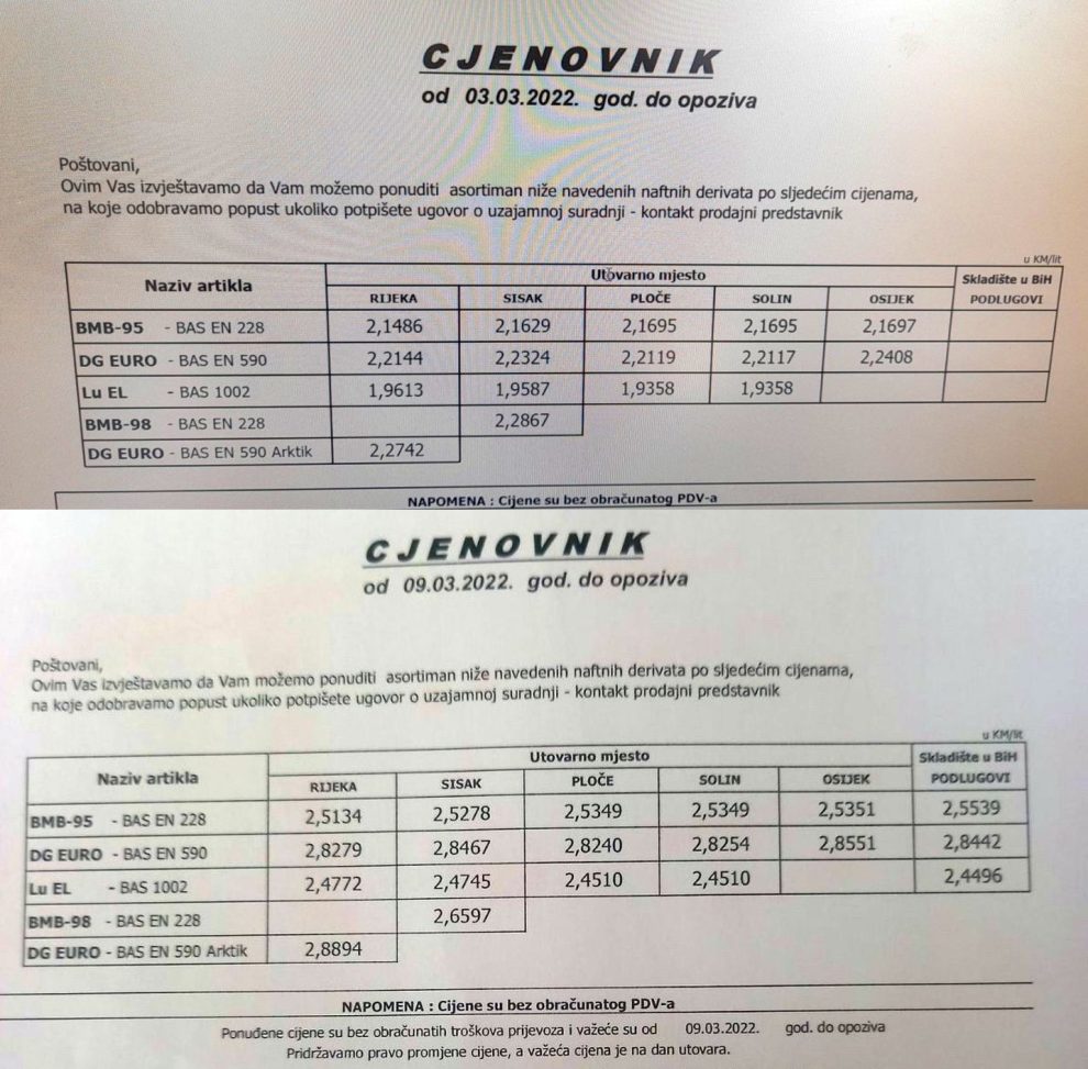 UMJESTO ZAKLJUČKA – u priloženom Cjenovniku NABAVNIH CIJENA DO VELEPRODAJNOG SKLADIŠTA jasno vam je da je cijena goriva za posljednjih šest dana “otišla u zrak” za 50-60 feninga. Na tu cijenu se onda uračunavaju dodatne obaveze i 17 posto PDV-a… Ipak, činjenica je da domaći distributeri (HIFA OIL kao najveći i ostali manji) čine sve da osiguraju barem kontinuitet nabavki, obzirom da je za sutra, kako nam je rečeno, najavljeno dodatno uvećanje nabavnih cijena za još 15 feninga.