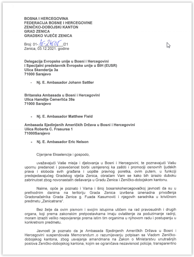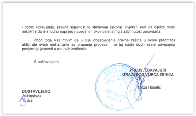 Pismo zabrinutosti predsjedavajućeg Gradskog vijeća Zenice