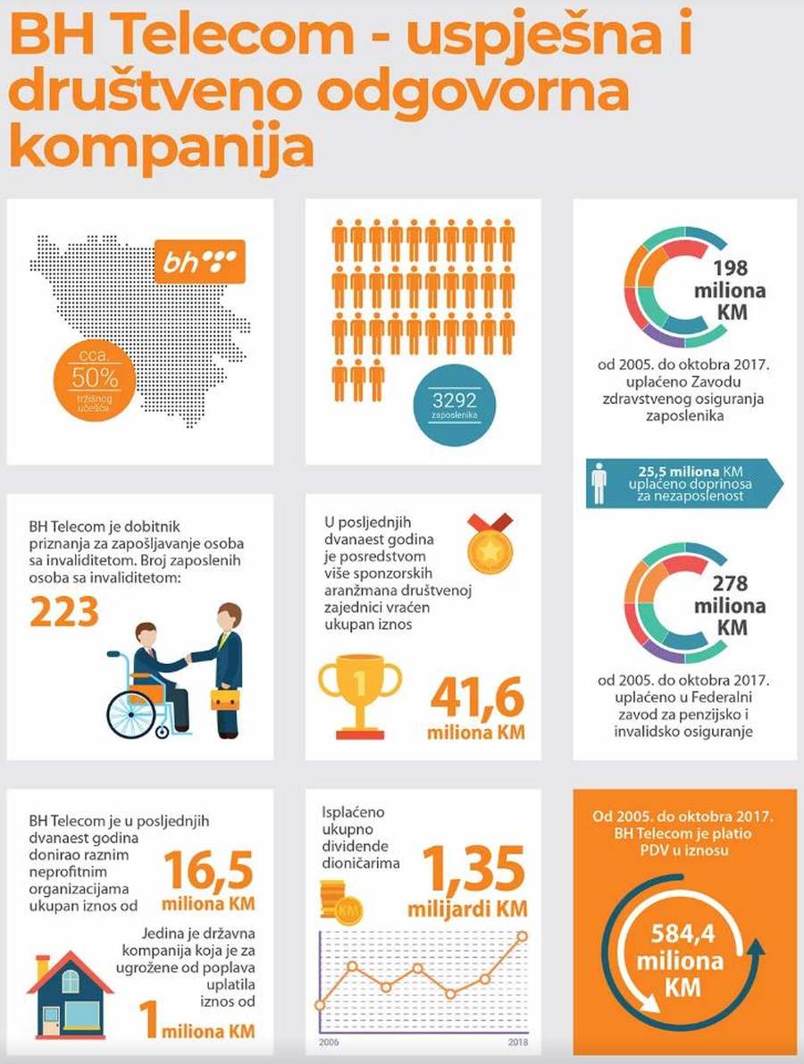 “Posredstvom više sponzorskih aranžmana u posljednjih dvanaest godina je društvenoj zajednici vraćen ukupan iznos od 41,6 miliona KM, od čega je 14,6 miliona KM usmjereno za ostvarenje uspjeha društveno značajnih partnera kao što su Nogometni savez BiH, Košarkaški savez BiH, Rukometna reprezentacija BiH, Reprezentacija sjedeće odbojke i slično. Kompanija kontinuirano podržava sve značajne kulturne događaje i institucije kao što su Zemaljski muzej, Nacionalna biblioteka, Festival Mess i brojni drugi. Također, značajano ulaže u brojne humanitarne projekte na području države, vodeći računa o socijalno ugroženim kategorijama društva. Ako govorimo o donacijama, BH Telecom godišnje dodjeljuje veoma transparentno milion KM donacija i od 2005. godine do danas je za ovu svrhu usmjereno 16,5 miliona KM. Ono što je značajno istaći jeste da smo posljednje tri godine radili tematske javne pozive za oblast obrazovanja, zdravstva i javnih kuhinja”, zaključio je Zaimović.