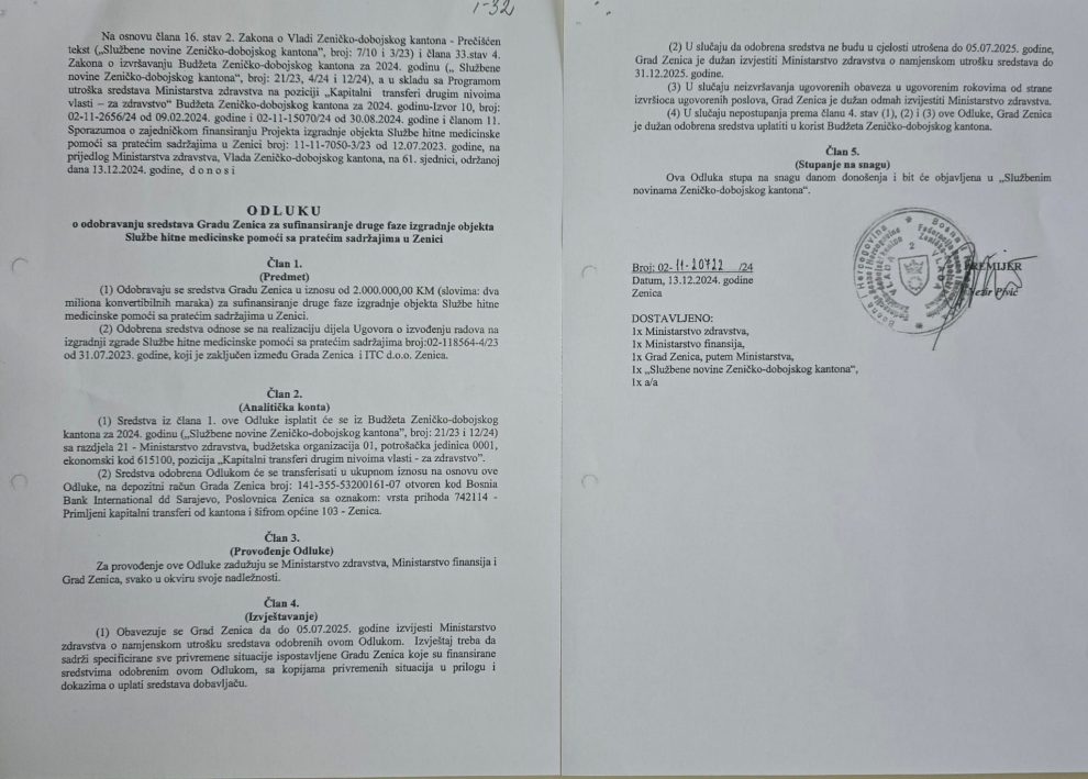 Zbog neistina koje je iznio gradonačelnik na sjednici Vijeća tvrdeći da Vlada Zeničko-dobojskog kantona nije finansijski podržala niti jedan projekat za Grad Zenicu, da je bivša premijerka donijela odluku i potpisala taj dokument, dajem na uvid javnosti Odluku od 13.12.2024. godine čiji sam potpisnik. Pomenutom odlukom odobrena su 2 miliona KM Gradu Zenica za sufinansiranje druge faze izgradnje objekta Službe hitne medicinske pomoći sa pratećim sadržajima u Zenici.