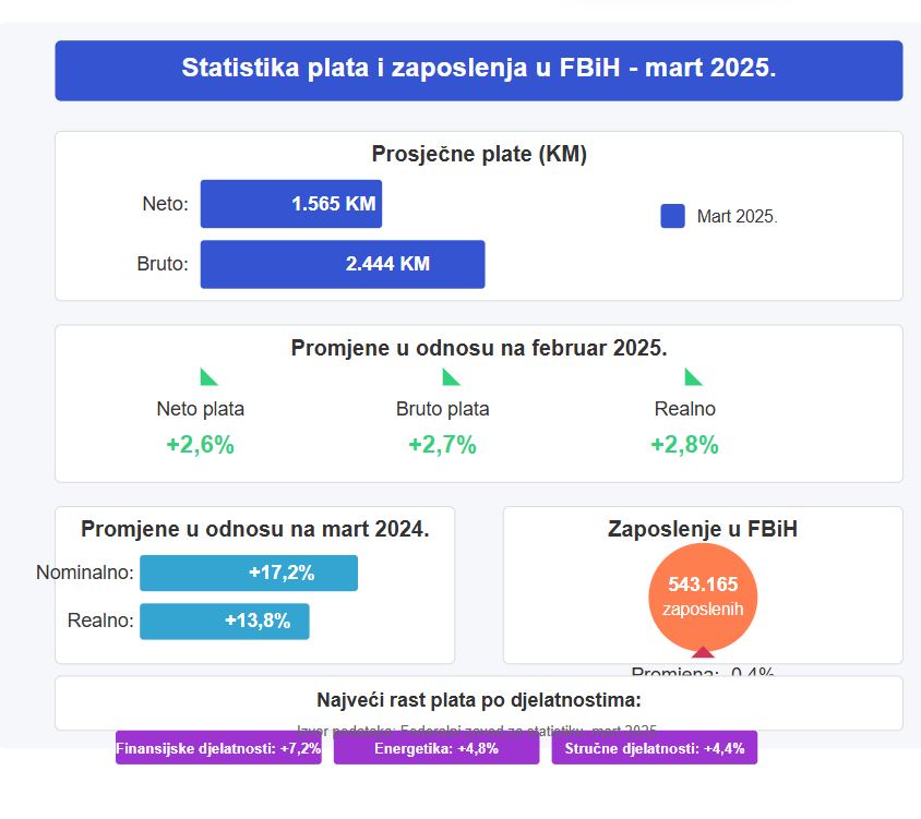 Prosječna mjesečna isplaćena bruto plata za mart 2025. godine u Federaciji BiH iznosila je 2.444 KM i nominalno je viša za 2,7 posto, a realno za 2,9 posto u odnosu na prethodni mjesec.