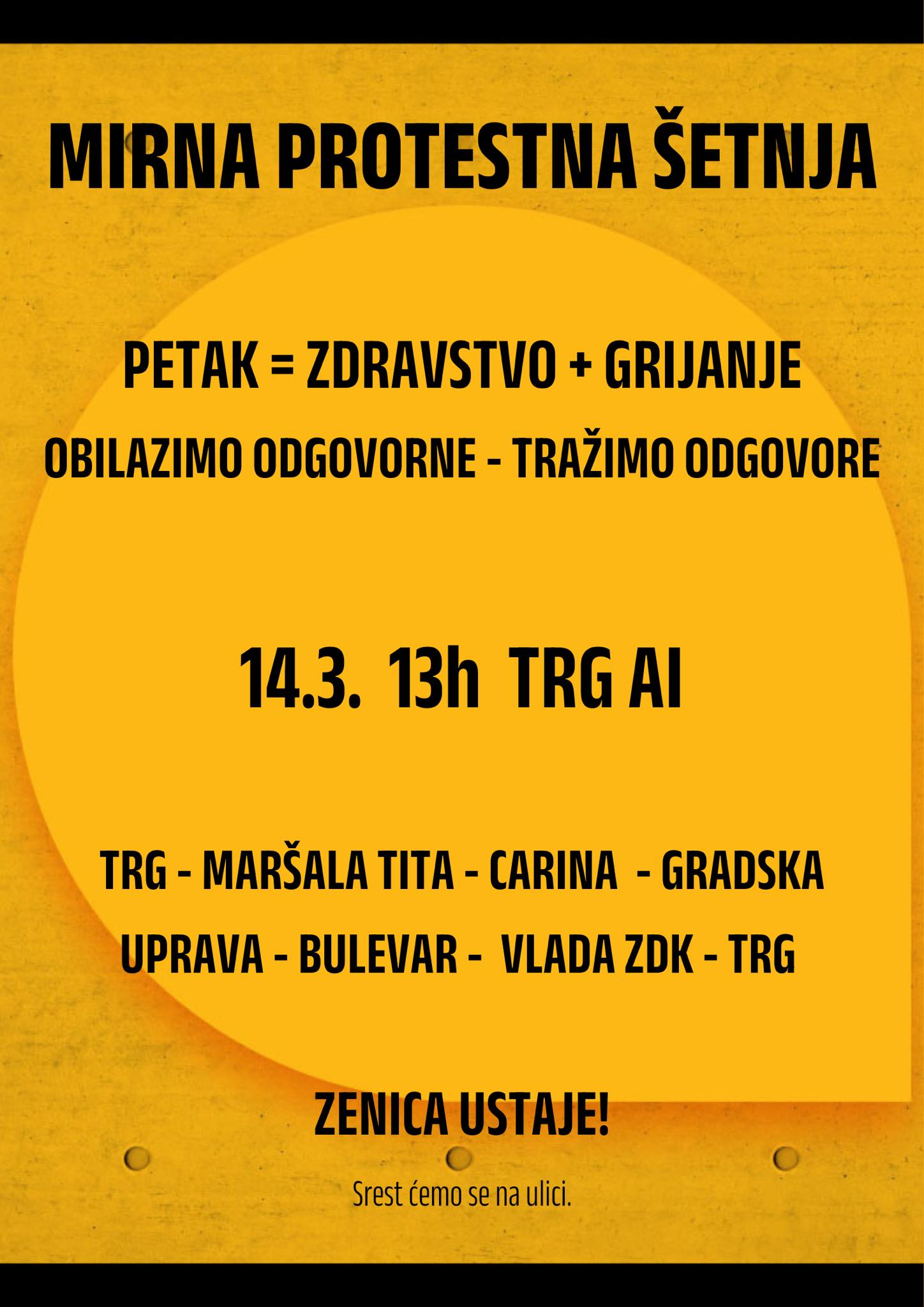 “Dragi Zeničani, na današnjem sastanku u MUP-u, policijaska uprava Zenica centar, dogovorena je naša standardna ruta, sa kraćim zadržavanjem ispred opštine i kantona, te povratkom na trg Alije Izetbegovića. Nažalost, uz svu našu želju i namjere da ruta protestne šetnje uz Gradsku upravu i Vladu ZDK ovaj put obuhvati i instituciju Zavod za zdravstveno osiguranje ZDK, takvu rutu ipak neće biti moguće realizovati ovog petka. Protestnu šetnju ulicama Masarykova prema ulici Aska Borića i Bulevarom neće biti moguće adekvatno osigurati niti obezbijediti sigurno kretanje učesnika” istakli su organizatori ovog događaja.