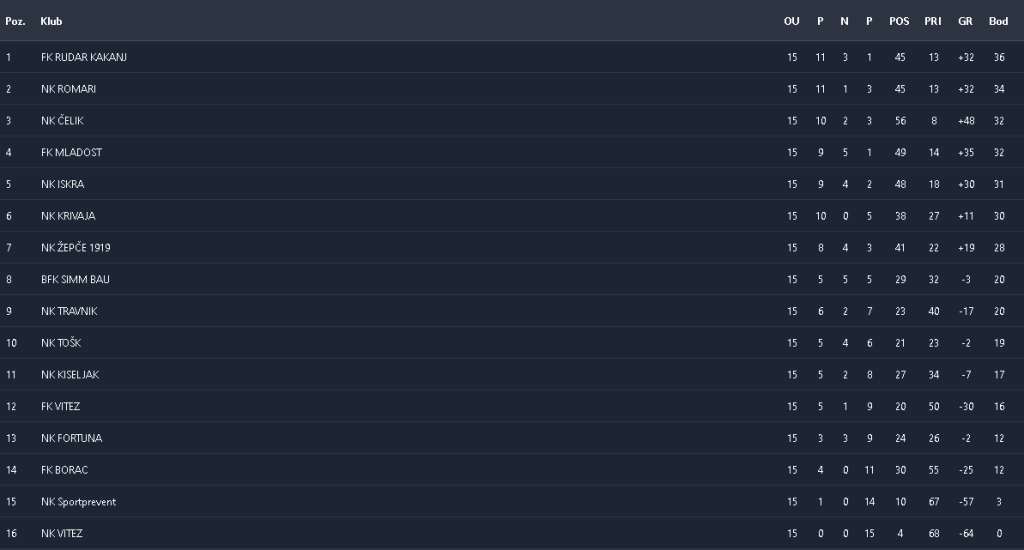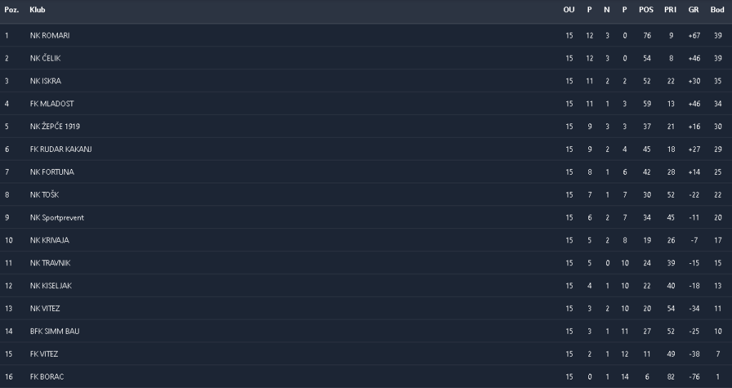 Tabela juniorske Omladinske lige BiH “Centar 2”