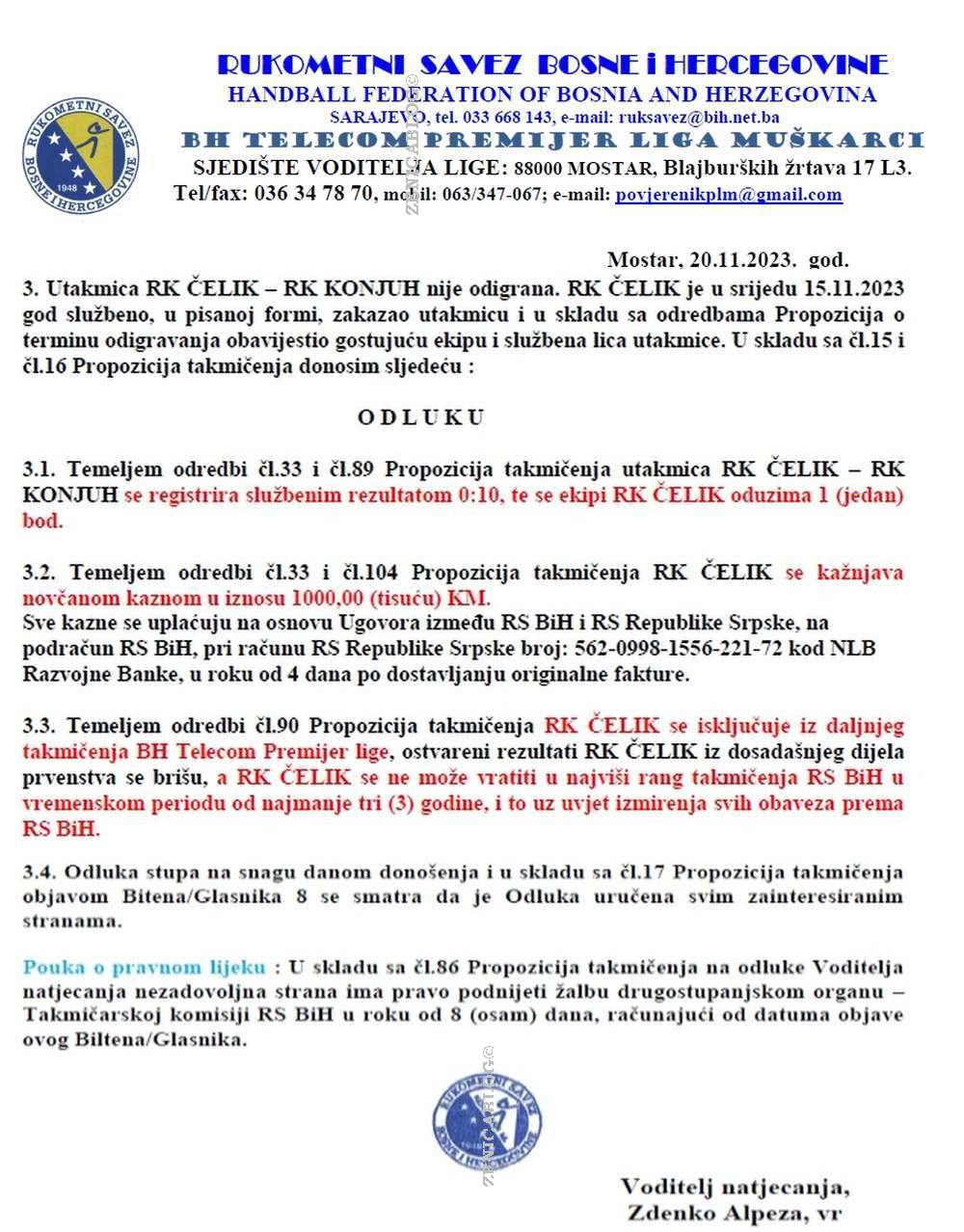 3.3. Temeljem odredbi čl.90 Propozicija takmičenja RK ČELIK se isključuje iz daljnjeg takmičenja BH Telecom Premijer lige, ostvareni rezultati RK ČELIK iz dosadašnjeg dijela prvenstva se brišu, a RK ČELIK se ne može vratiti u najviši rang takmičenja RS BiH u vremenskom periodu od najmanje tri (3) godine, i to uz uvjet izmirenja svih obaveza prema RS BiH.