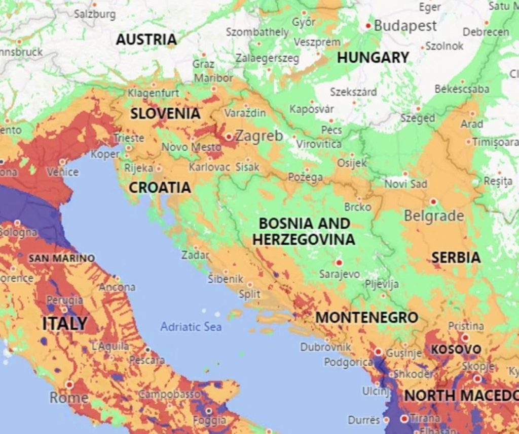 Veći rizik od zemljotresa postoji u Italiji, Albaniji, Grčkoj i Turskoj, gdje prevladavaju crvena i ljubičasta boja.