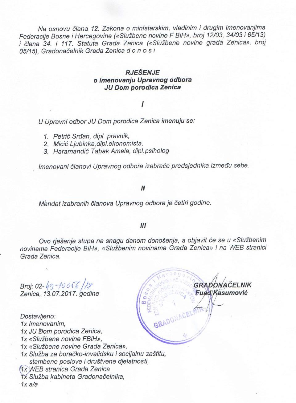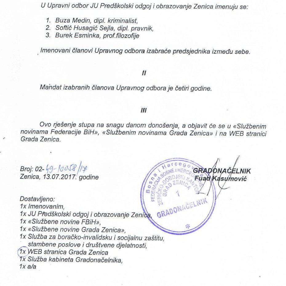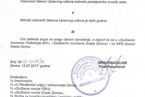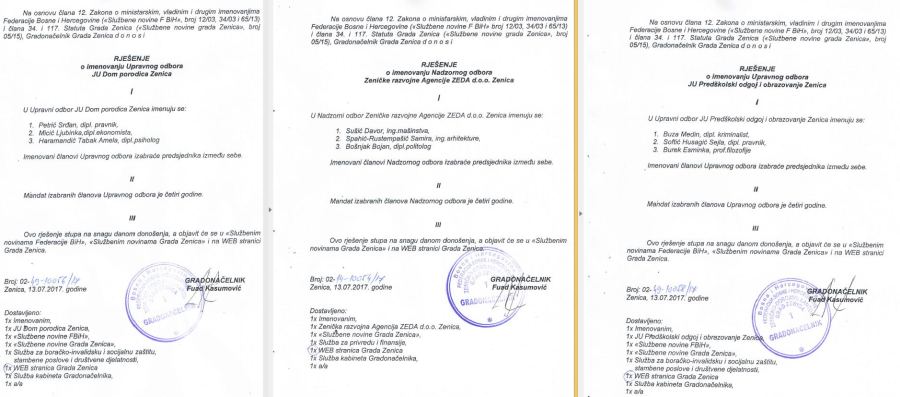 Pogledajte imena novih članova Nadzornih i Upravnih odbora u Dom-porodici, ZEDA-i i Predškolskom odgoju i obrazovanju – Gradonačelnik Zenice Fuad Kasumović donio je rješenja o imenovanju članova uprava tri javna preduzeća i ustanove.