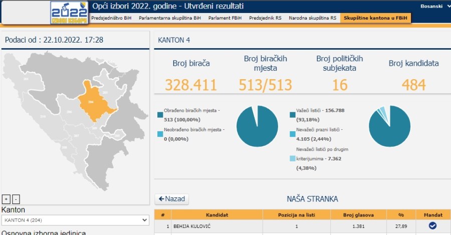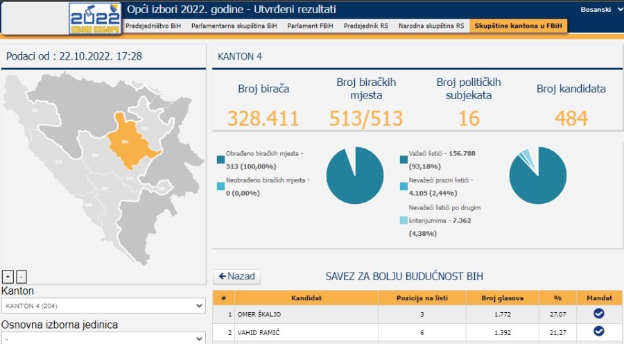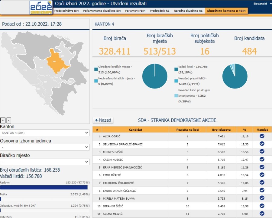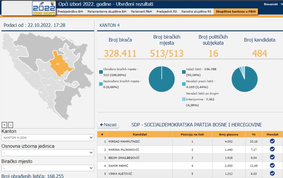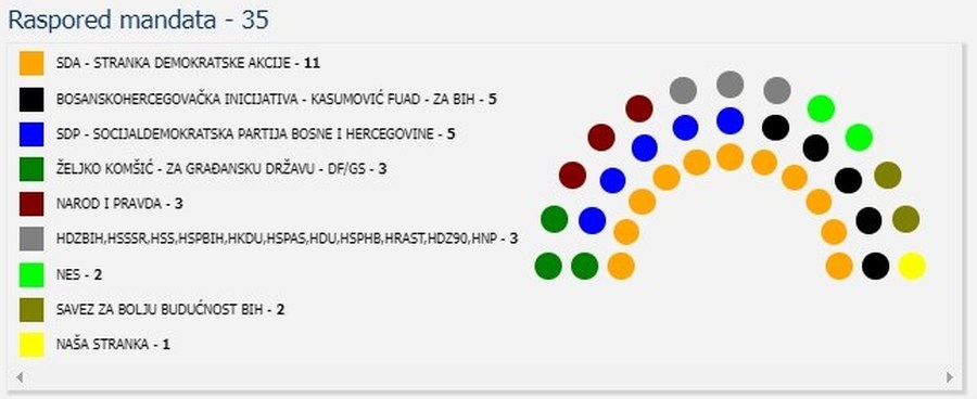 Devet stranaka imaće zastupnike u Skupštini ZDK, i to redoslijedom kako je navedeno, sa 11 zastupnika SDA, po pet SDP-a i BHI-KF, tri DF/GS, HDZ/HNS i NiP, dva NES i SBB BIH, te jedan NS,