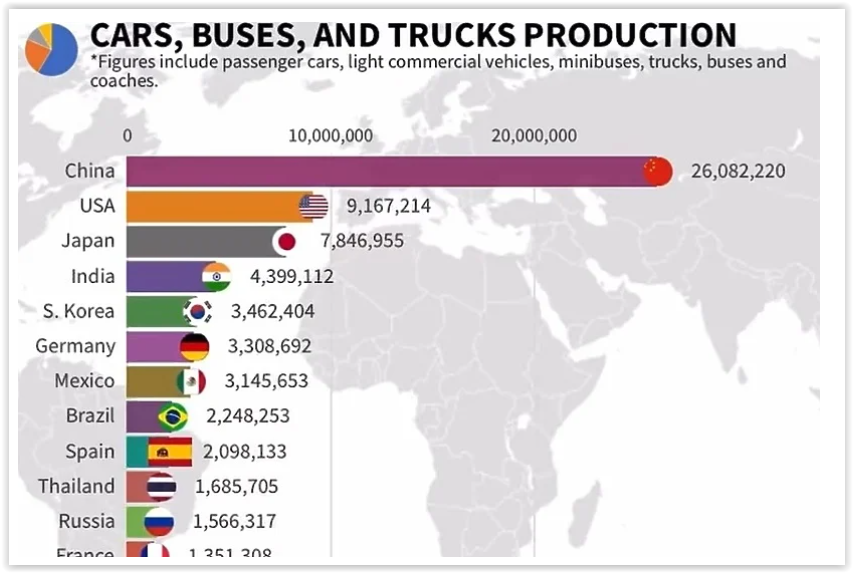 Prema podacima Međunarodne organizacije proizvođača motornih vozila, Japan je 70-ih sustigao SAD i to je bio slučaj do sredine 90-ih. Tada Kina strelovito sustiže sve ostale zemlje te na početku 21. stoljeća postaje najvećim svjetskim proizvođačem motornih vozila – automobila, autobusa i kamiona.