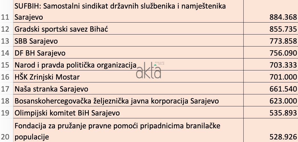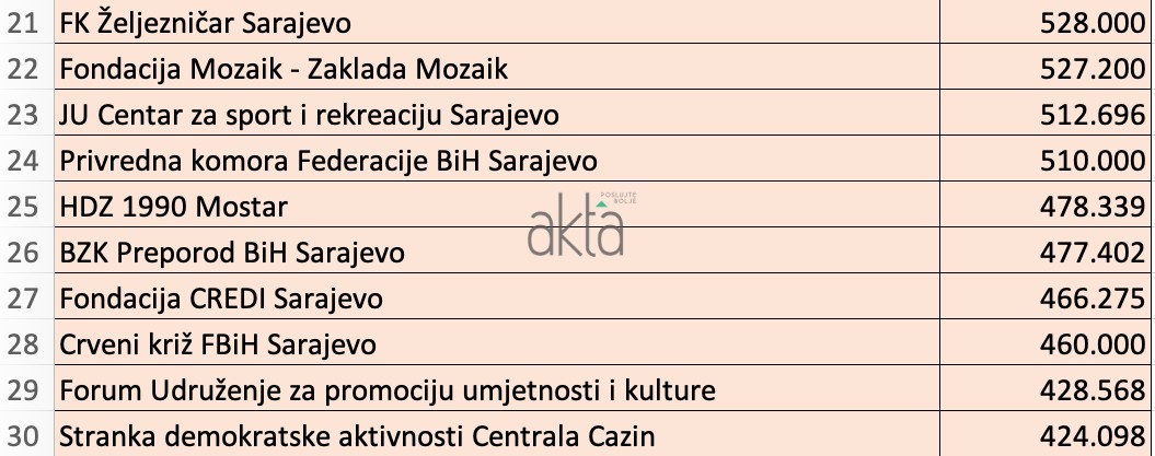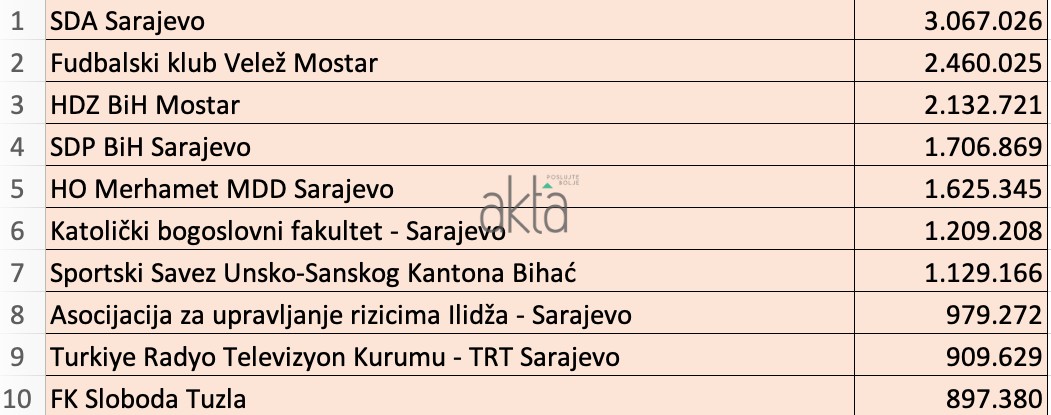 Kao i svake godine, na vrhu liste nalaze se političke organizacije. Tako je i 2021. godine najviše novca iz budžeta “izvukla” SDA Sarajevo i to preko tri miliona KM. Slijedi je FK Velež sa 2,4 miliona KM, te stranke HDZ BiH sa 2,1 milion KM I SDP BiH 1,7 miliona KM.