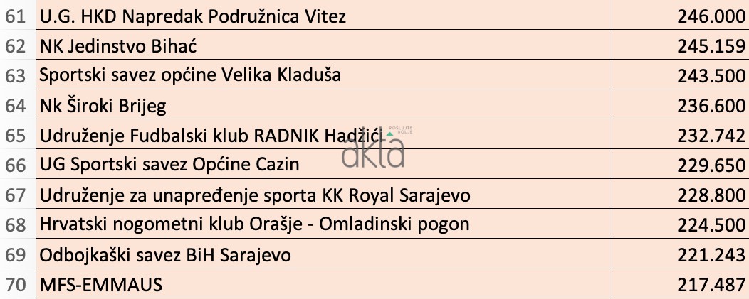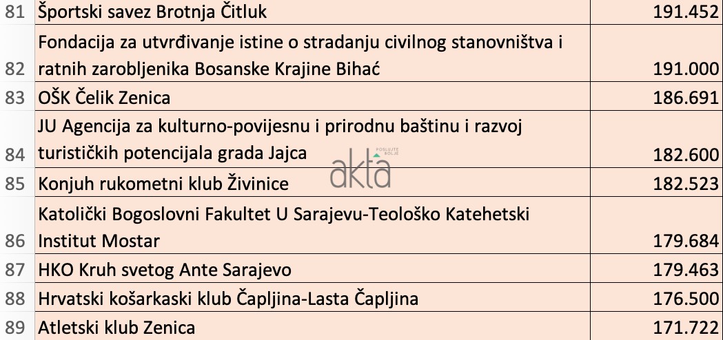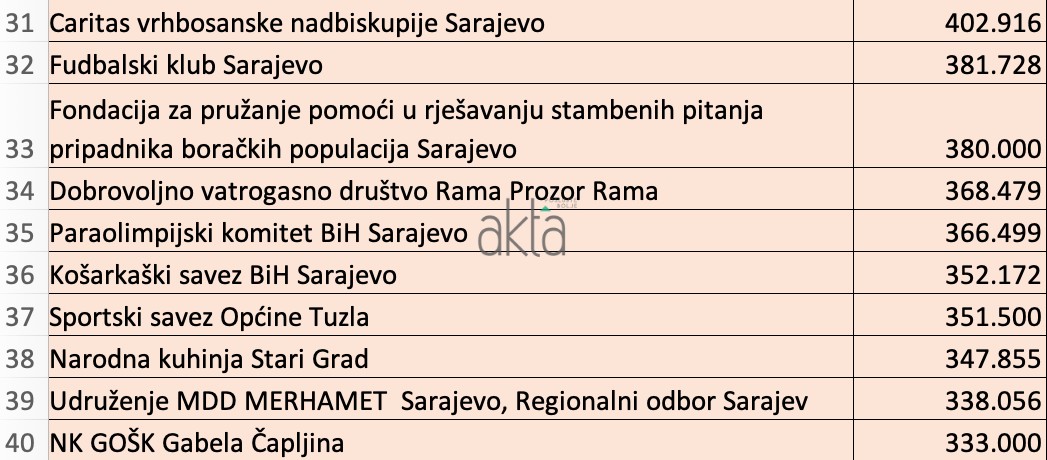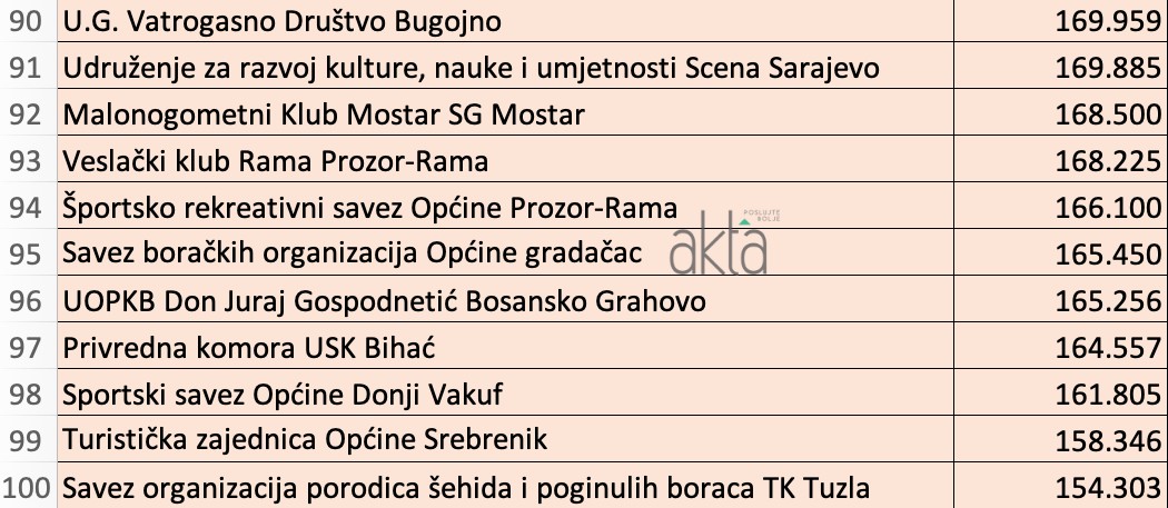 Značajna sredstva dobio je veliki broj boračkih udruženja i saveza, a za razliku od prethodnih godina, na ovogodišnoj listi uglavnom dominiraju sportska udruženja piše Akta.ba