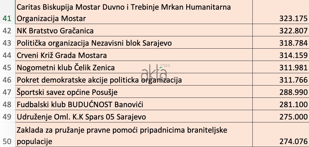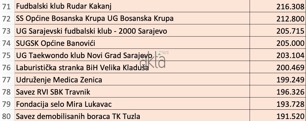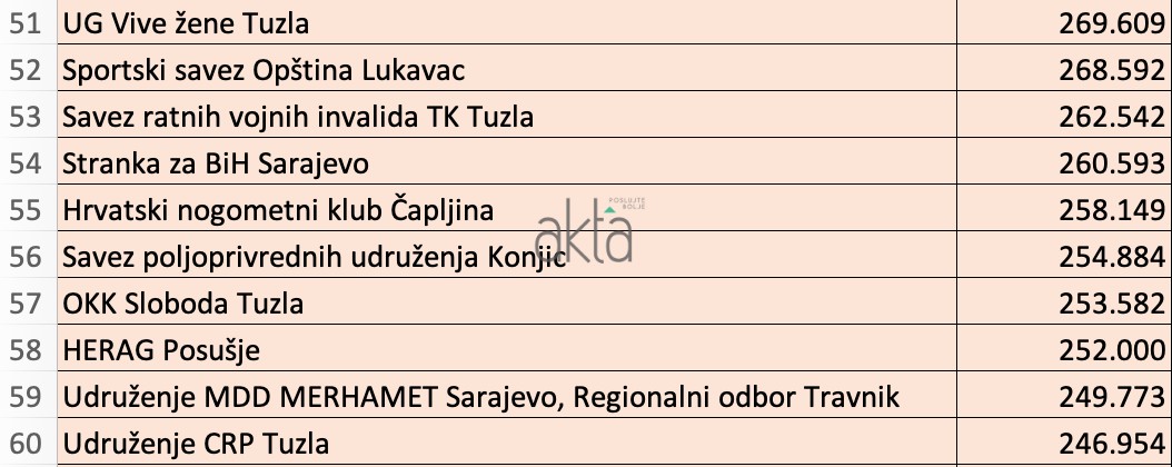 9.576 udruženja Federacije BiH povuklo je iz budžeta 113,6 miliona KM, od kojih je prvih 100 ukupno dobilo oko 45 miliona KM. Najviše novaca dobile su političke partije, sportska udruženja, a zanimljivo je i da novcima bh. građana finansiramo i tursku državnu televiziju TRT.