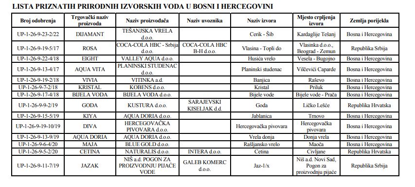 Pogledajte Listu priznatih prirodnih mineralnih i prirodnih izvorskih voda u Bosni i Hercegovini nalazi se ukupno 71 voda.