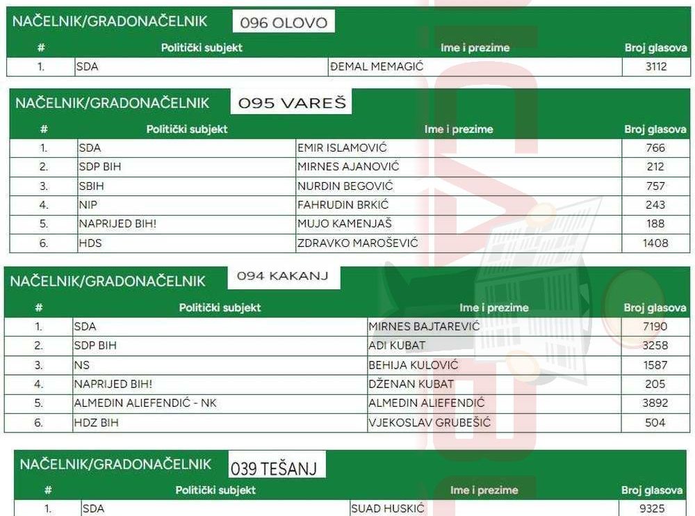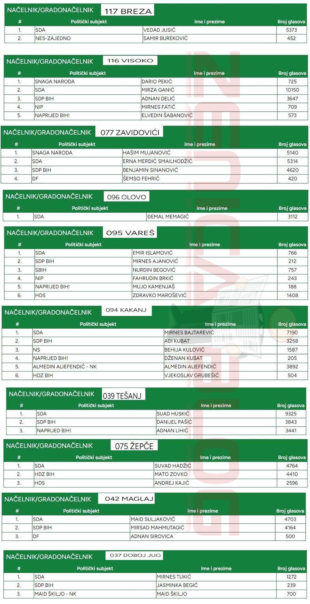 Osim načelnika Olova Đemala Memagića (SDA), koji nije imao protiukandidata, prema sadašnjim, preliminarnim rezultatima koje objavljuju stranke i mediji, gradonačelnički mandat odbranio je i gradonačelnik Visokog Mirza Ganić (SDA), zatim načelnik Tešnja Suad Huskić (SDA), Zdravko Marošević (HDS) u Varešu, Mirnes Tukić (SDA) u Doboj Jugu, Mirnes Bajtarević (SDA) u Kaknju, Vedad Jusić (SDA) u Brezi, dok je SDA dobila i gradonačelnicu Zavidovića, koje bi u naredne četiri godine trebala voditi Erna Merdić- Smailhodžić.
