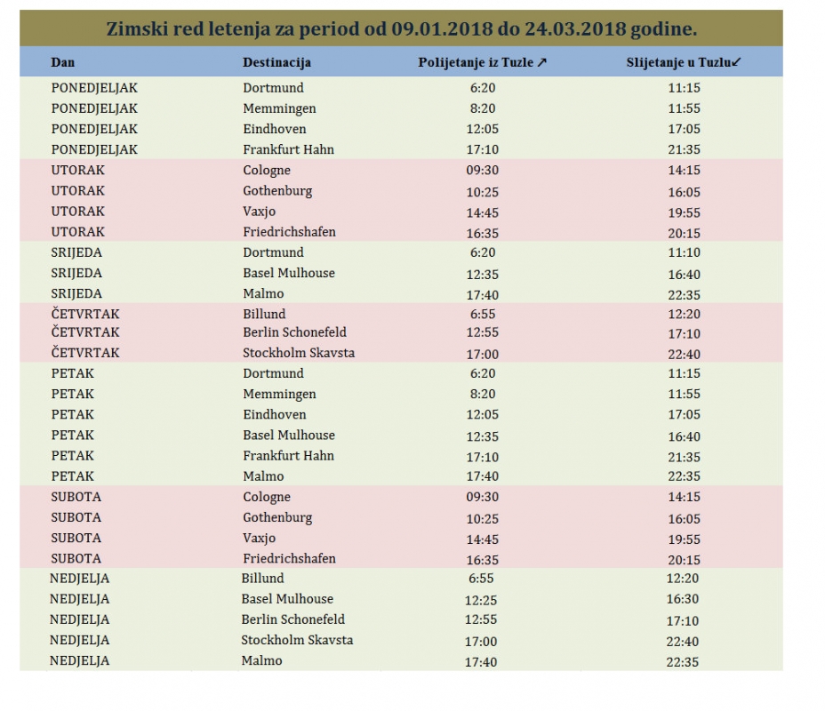Pogledajte novi red letenja na tuzlanskom aerodromu do 24.3.2018.