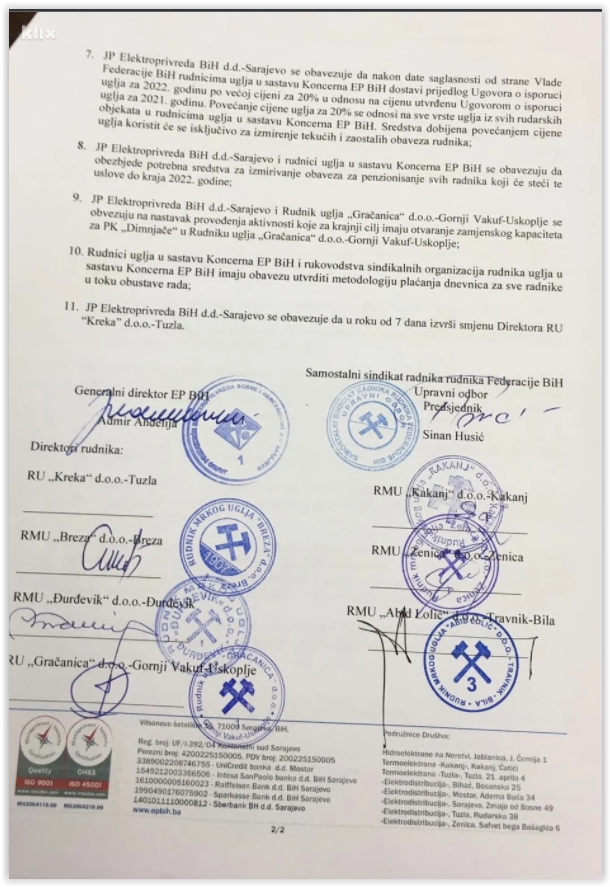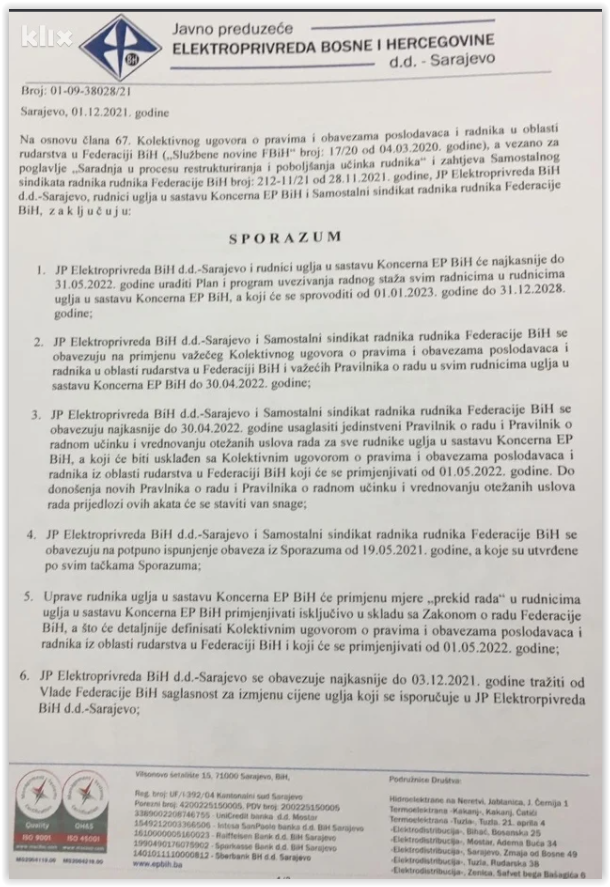 Elektroprivreda se obavezuje, nakon date saglasnosti Vlade FBiH, da će rudnicima dostaviti prijedlog Ugovora o isporuci uglja za 2022. godinu po većoj cijeni za 20 posto u odnosu na cijenu utvrđenu Ugovorom o isporuci uglja za 2021. godinu. Povećanje cijene uglja za 20 posto se odnosi na sve vrste uglja iz svih rudarskih objekata u rudnicima uglja u sastavu koncerna EPBiH- Sredstva dobijena povećanjem cijene uglja koristit će se isključivo za izmirenje tekućih i zaostalih obaveza rudnika