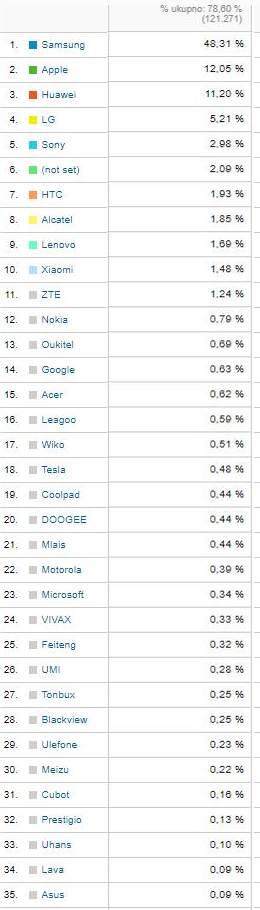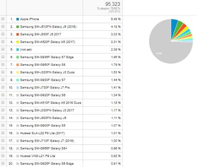 Zahvaljujući sveobuhvatnosti mogućnosti Analitiksa, donosimo vam i pojedinačne vrste uređaja koji pristupaju našoj stranici, pogledajte gdje uređaj poput vašeg na spisku. Pojedinačno, prednjači Iphone, jer se oni identifikuju kao jedan uređaj bez obzira na model, osim kad je u pitanju najnoviji Iphone X.