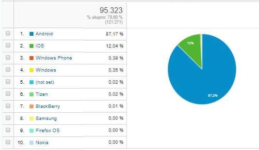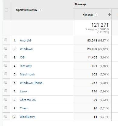 Kada se gleda operativni sistem, logično obzirom na prethodne rezultate, vode ubjedljivo Android uređaji, koji sa IOS-om iznose ubjedljivih 99,21 svih mobilnih uređaja.