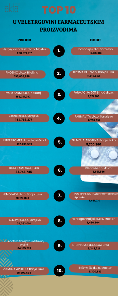 Poslovni portal Akta.ba i ove godine je uradio analizu TOP 10 kompanija u Bosni i Hercegovini kada je u pitanju farmaceutska industrija i trgovina na veliko farmaceutskim proizvodima.