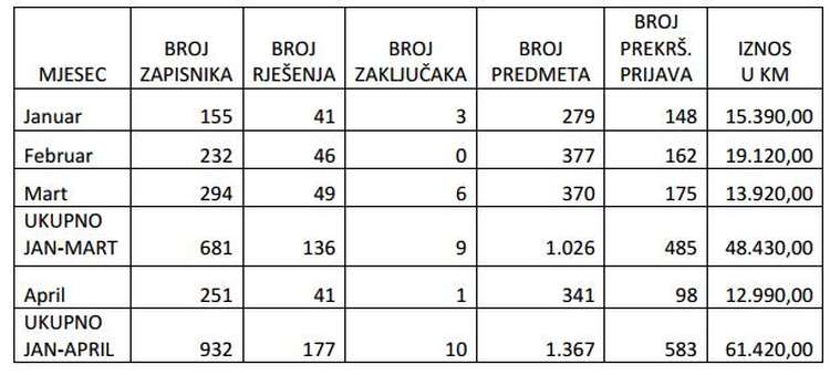 Pogledajte učinak zeničkih inspektora u 2016.- Tabelarni pregled po mjesecima sačinjenih zapisnika o inspekcijskom nadzoru, donesenim rješenjima, zaključcima, zaprimljenim predmeta, podnesenih prekršajnih prijava (prekršajni nalozi i zahtjevi za pokretanje prekršajnog postupka) i izrečenim prekršajnima nalozima i sudskim rješenjima – pogledajte: