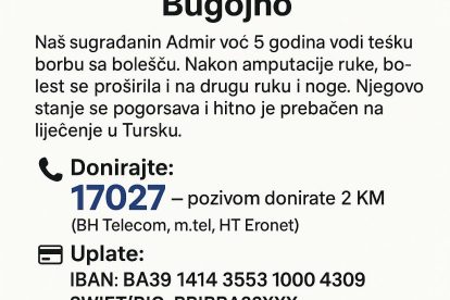 Građani se pozivaju da pomognu donacijama putem telefonskog broja 17027 – pozivom se doniraju 2 KM (BH Telecom, m:tel, HT Eronet).