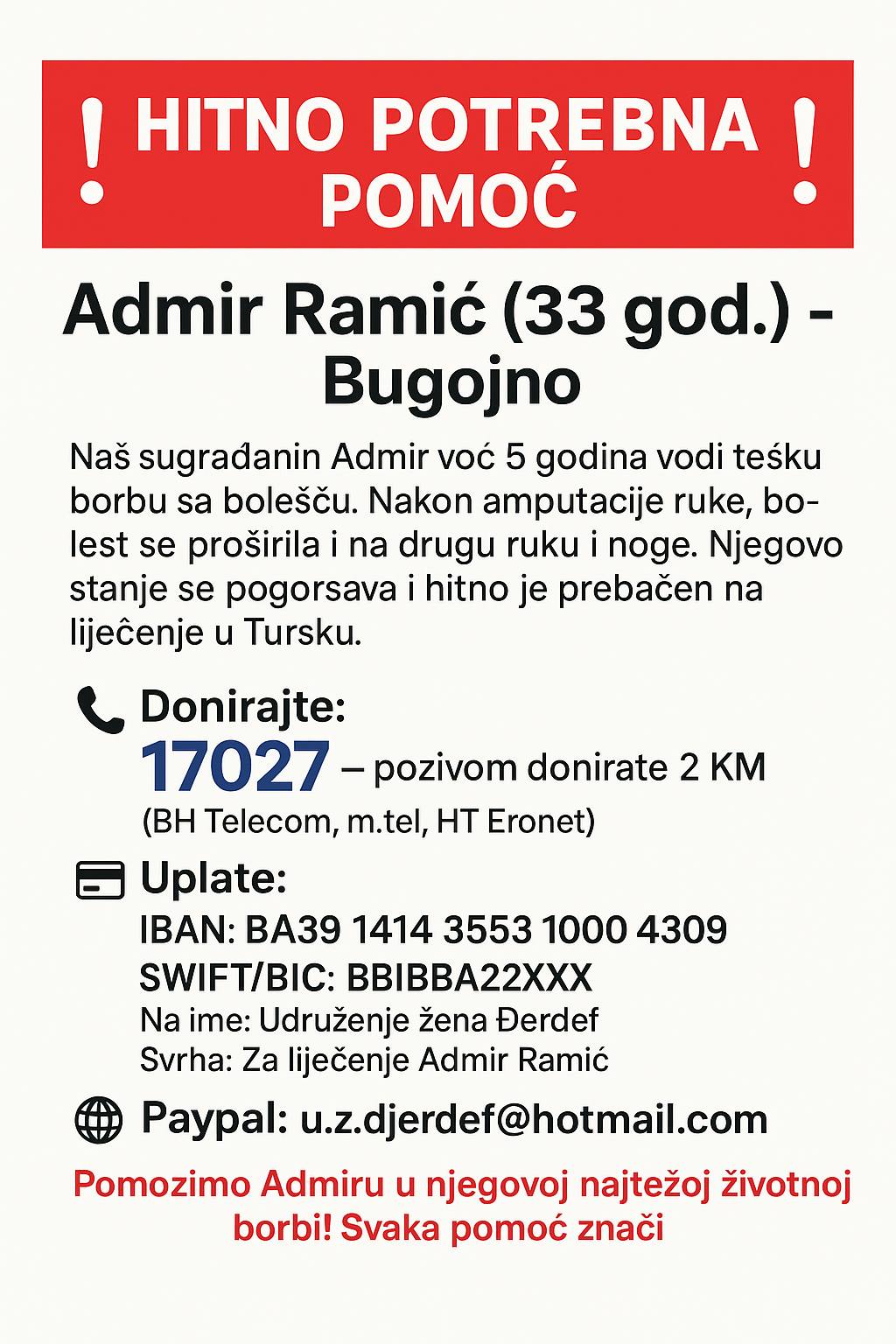 Organizatori apela naglašavaju da je Admiru hitno potrebna pomoć te da svaka donacija i podjela apela mogu značiti mnogo u njegovoj najtežoj životnoj borbi.