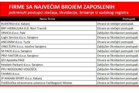 -Čak šest od ovih 19 firmi, kod kojh je zaključen stečajni ili likvidacioni postupak brisano je iz sudskog registra, među kojima je i „Vino-Župa“ iz Istočnog Sarajeva, „M-Pack“ Sarajevo, „ZNSM-BLK“ iz Broda i JP „Kakanj-Sport“. Sigurno najzvučnije ime na ovoj listi je „Hewlet-Packard d.o.o.“ Sarajevo obzirom da je HP svjetski poznat i jedan od vodećih brendova u prodaji računarske opreme, štampača i sl. Osim nastupanja pravnih posljedica brisanja iz registara preduzeća, ovim je direktno pogođen i veliki broj zaposlenih u tim firmama – istakla je Mašović.