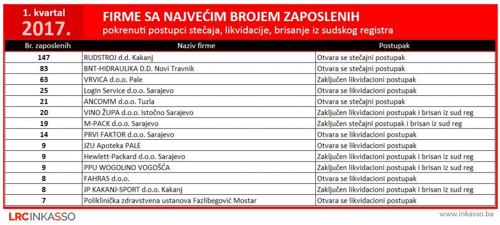 Prema riječima Sabine Mašović, rukovodioca pravne službe „LRC  Inženjering“,  u  prvom kvartalu 2017. godine  otvoreno je 55 stečaja i 184  likvidacije, što je za 5 postupaka stečaja i 29 postupaka  likvidacija firmi manje u odnosu na isti period 2016. godine. Istovremeno,  iz registra pravnih lica za prva tri mjeseca 2017.  izbrisano je ukupno 158 firmi, što je za 22 ugašene firme manje u odnosu na isti period prošle godine.