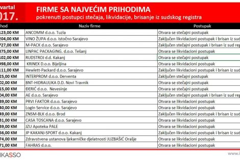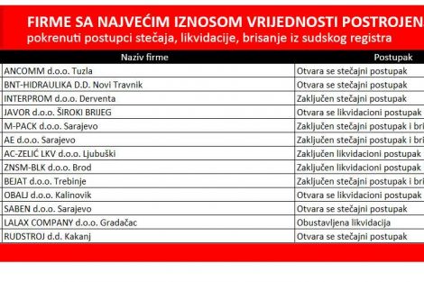 Kanton Sarajevo ostao je na prvom mjestu među pet regija sa najvećim brojem otvorenih i zaključenih likvidacionih postupaka, a potom slijede Tuzlanski, Zeničko-Dobojski, Hercegovačko-Neretvanski i Srednjobosanski kanton.