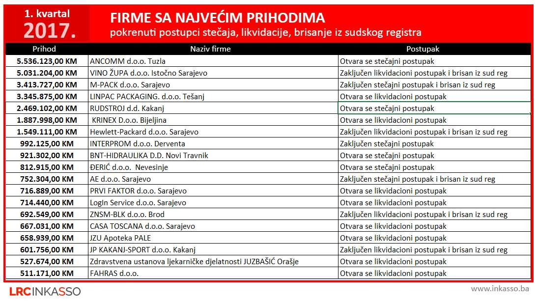 Prema riječima Sabine Mašović, rukovodioca pravne službe „LRC  Inženjering“,  u  prvom kvartalu 2017. godine  otvoreno je 55 stečaja i 184  likvidacije, što je za 5 postupaka stečaja i 29 postupaka  likvidacija firmi manje u odnosu na isti period 2016. godine. Istovremeno,  iz registra pravnih lica za prva tri mjeseca 2017.  izbrisano je ukupno 158 firmi, što je za 22 ugašene firme manje u odnosu na isti period prošle godine.