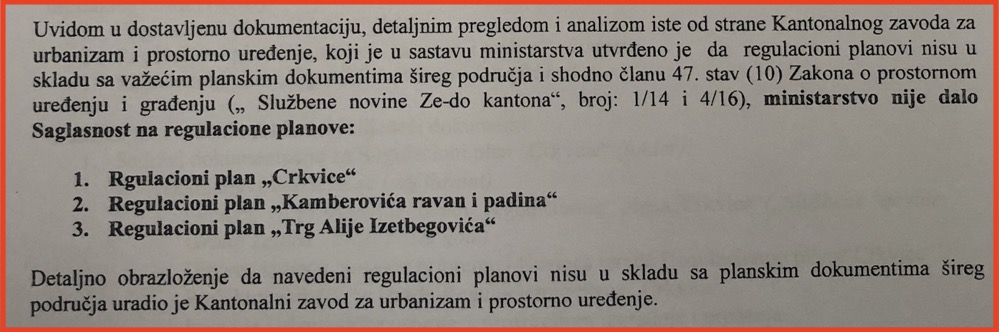 S druge strane, Ministarstvo za prostorno uređenje, promet i komunikacije i zaštitu okoline ZDK nije dalo saglasnost za navedene regulacione planove, jer nije ispoštovana usaglašenost prema planskim dokumentima višeg reda.