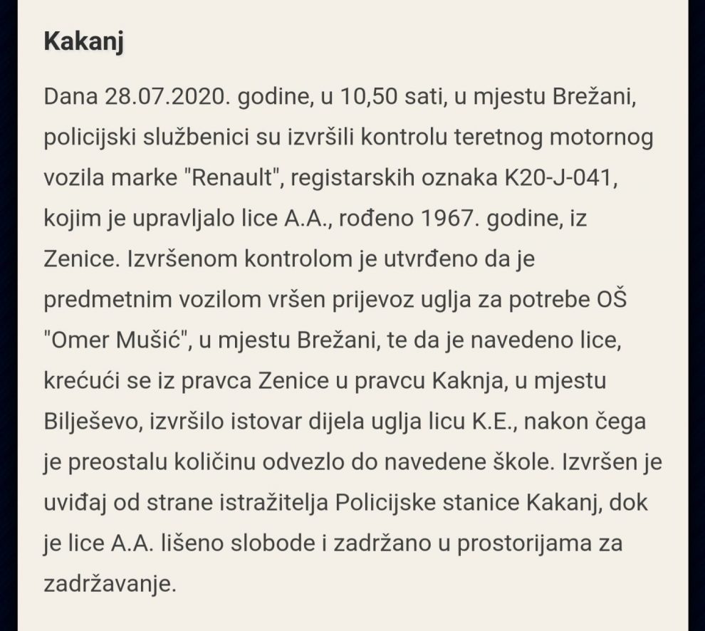 Pripadnici Uprave policije Ministarstva unutrašnjih poslova Zeničko-dobojskog kantona su posljednjih nekoliko dana, u dva navrata po dojavama građana, intervenisali i spriječili krađu uglja i drugih energenata koji su transportovani za potrebe školskih objekata u ovom kantonu.