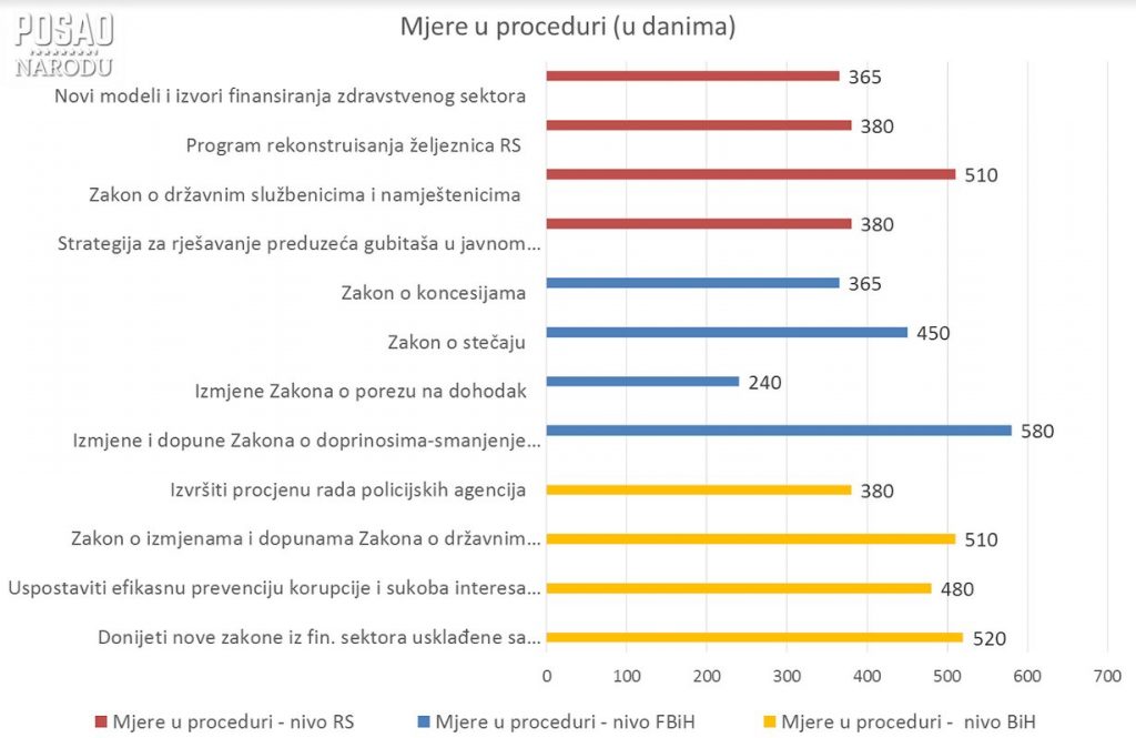 Neke mjere su u parlamentarnoj proceduri po nekoliko mjeseci ili čak više od godinu dana. U nastavku je pregled takvih mjera po nivoima vlasti: