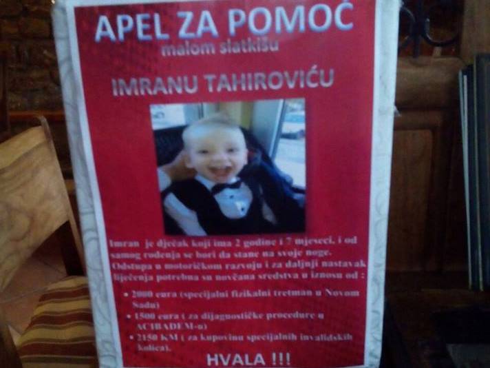 Pomozimo dječaku Imranu Tahiroviću – Našem malenom sugrađaninu, Imranu Tahiroviću, dječaku koji ima dvije i po godine i koji samo leži, jer ima problem sa motorikom potrebna je naša pomoć!