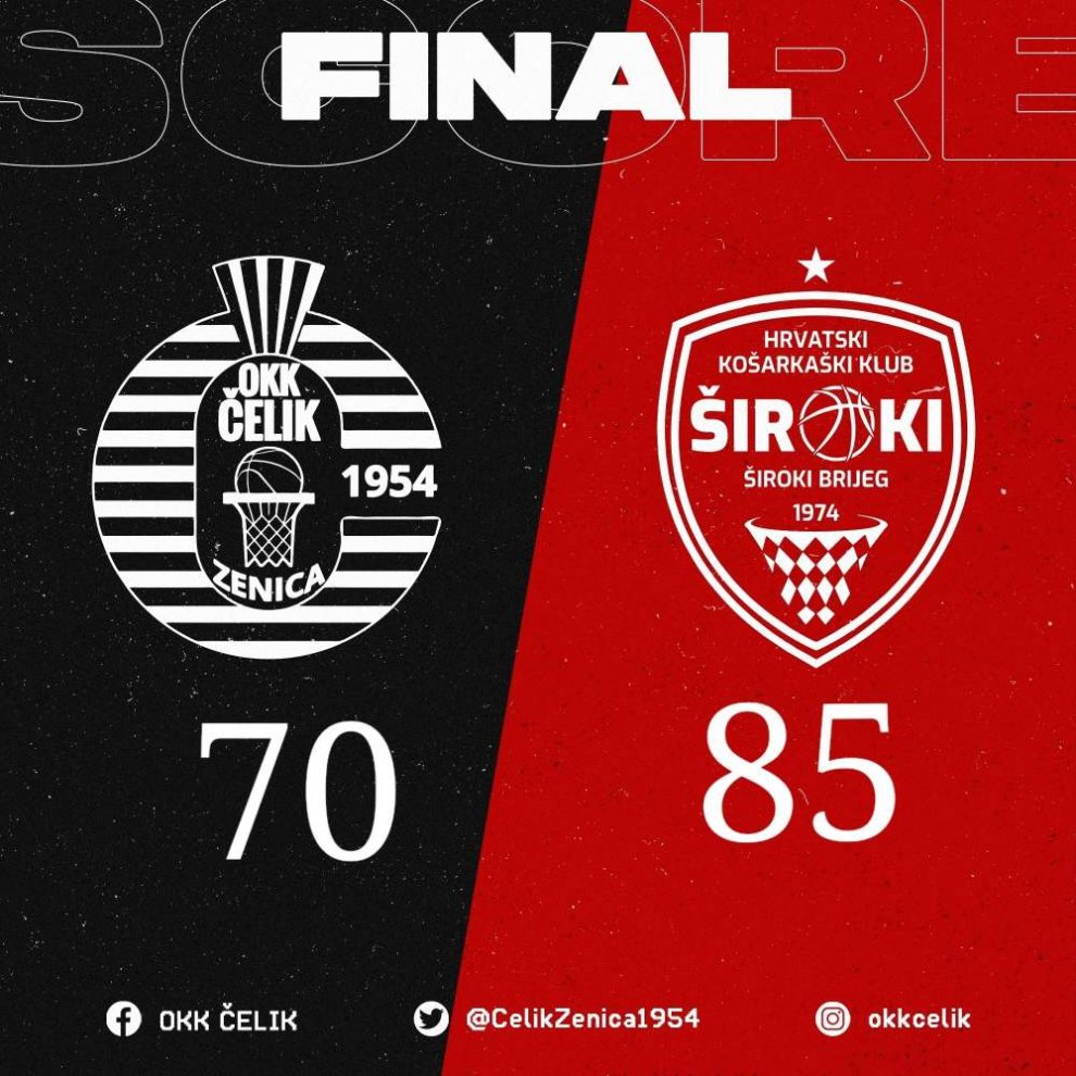 Srđan Gavrić 6, Haris Ćurevac 9, Haris Delalić 13, Meris Bečirović 4, Milivoje Božović 22 p.+ 14 skokova, Kristijan Tomić 1, Benjamin Bajramović, Armin Avdibegović (cap) 2, Anes Podojak 6, Ranko Križanović 7, Namik Varupa, Dino Merdanović. (Trener Josip Pandža, pomoćni trener Bojan Stevanović); U ekipi Čelika dvocifreni su bili Milivoje Božović sa 22 i Haris Delalić sa 13 poena; Kod ekipe Široki najefikasniji Dario Drežnjak 24, Aaron Thomas 19 i Patrick Rembert 15 poena. Košarkaši Čelika doživjeli su i četvrti poraz u Ligi 6 za prvaka BiH, uz jednu pobjedu, a košarkaši Širokog ostvarili su treću pobjedu uz dva poraza.