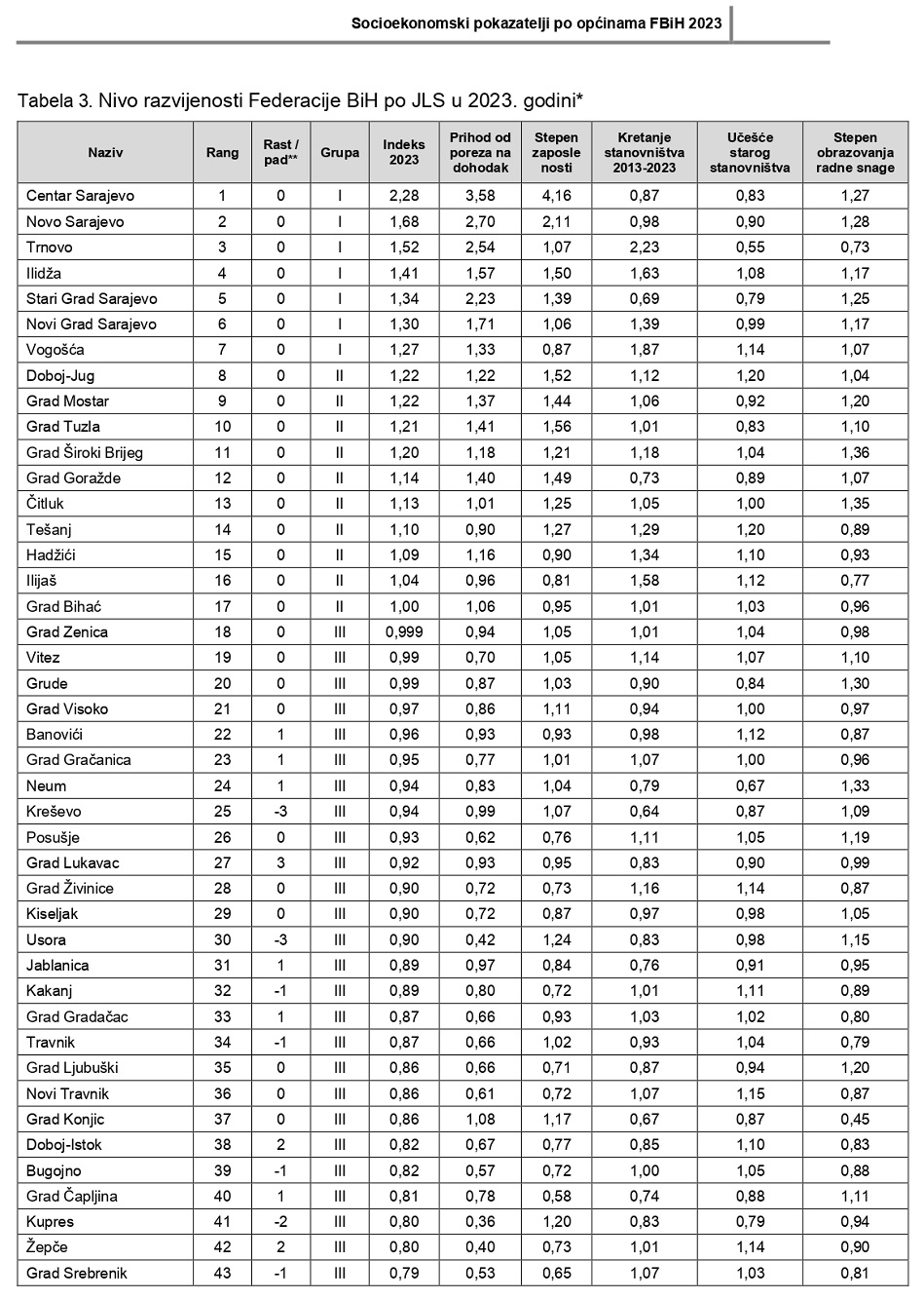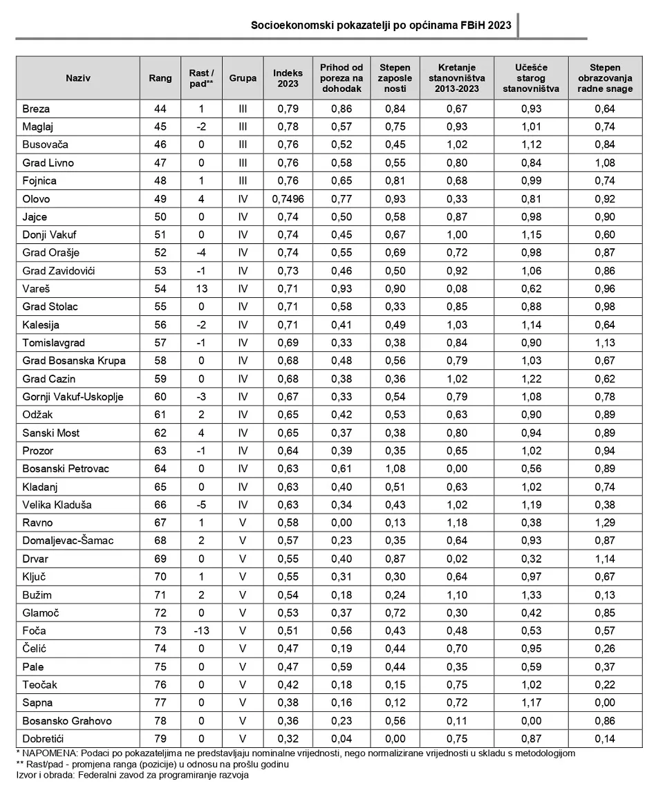 Inače, svrha dokumenta “Socioekonomski pokazatelji po općinama u Federaciji Bosne i Hercegovine 2023.” je da se sagledaju osnovni društveno-ekonomski pokazatelji razvoja u jedinicama lokalne samouprave (JLS) FBiH te da se rangiraju lokalne zajednice i kantoni prema nivou razvijenosti.