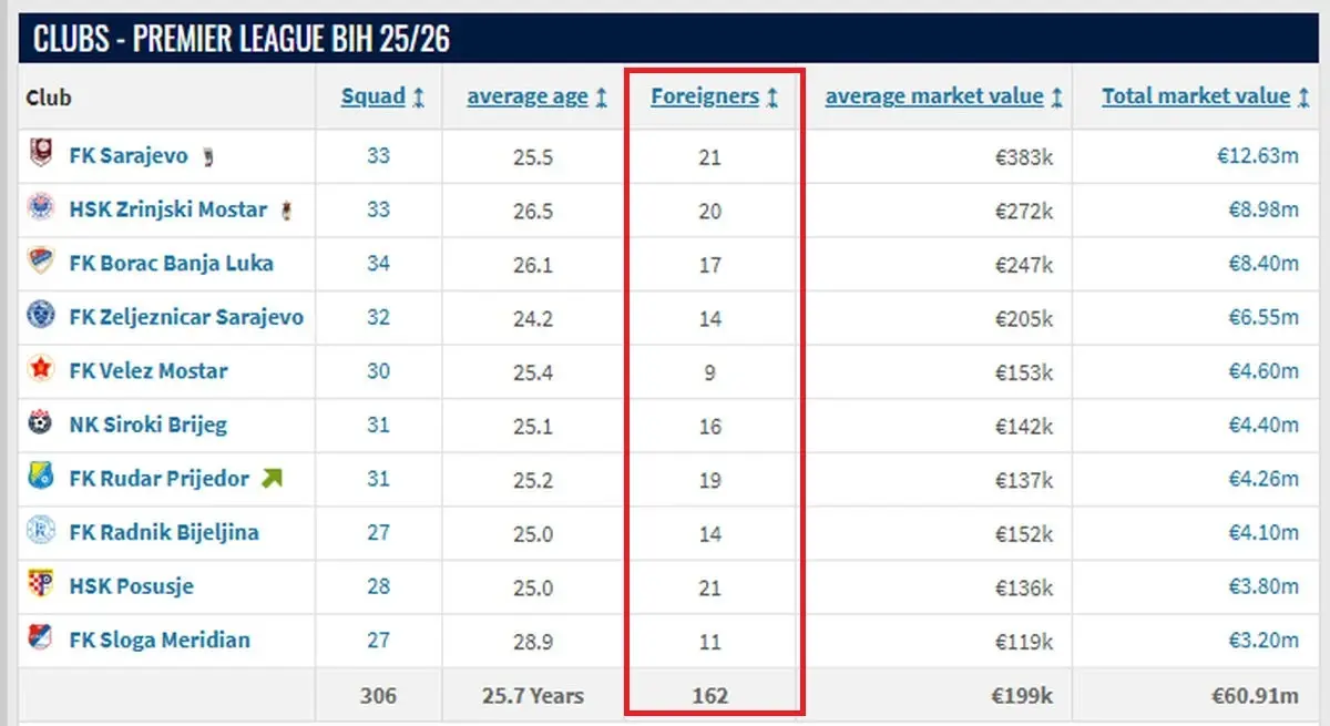 Iako je Rudar Prijedor (19) u prvom planu zbog šesterice Španaca, Sarajevo (21), Posušje (21) i Zrinjski (20) su klubovi sa najviše stranaca u timu.