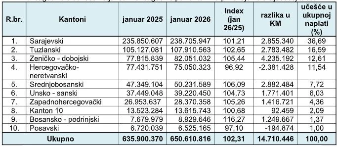 Iz Porezne uprave Federacije Bosne i Hercegovine (PU FBiH) saopćili su da su porezni obveznici u ovom entitetu prošli mjesec uplatili 650,61 milion KM javnih prihoda, što je u odnosu na januar 2025. više za 14,71 milion KM, odnosno za 2,31 posto.