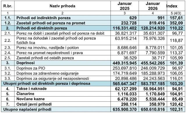 U dolje priloženoj tabeli sadržani su podaci o strukturi uplate javnih prihoda tokom prošlog mjeseca i tokom januara 2025. godine.