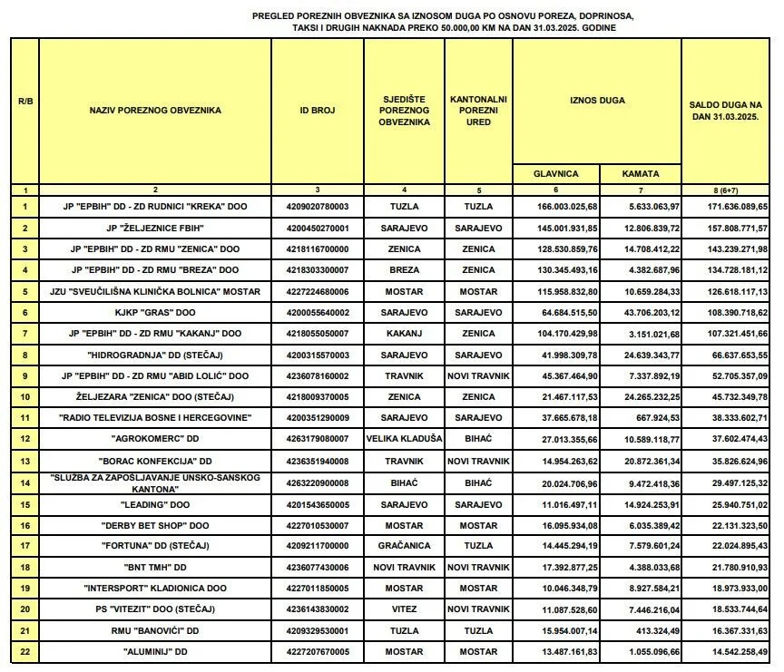Porezna uprava Federacije BiH objavila je popis najvećih poreznih dužnika, a vrh ljestvice i dalje zauzimaju javna poduzeća.
