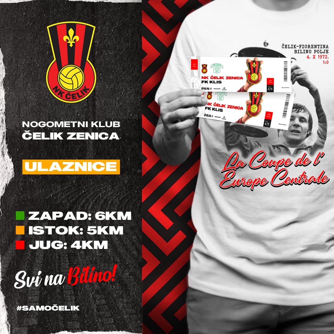 Ulaznice za utakmicu možete kupiti u objektima naših prijatelja: Caffe bar Šibica, Caffe bar Avanti, Caffe bar Crem, Caffe bar Balgera, Caffe bar Bonaparte i Gradska kafana Zenica -, objavili su na NK Čelik.