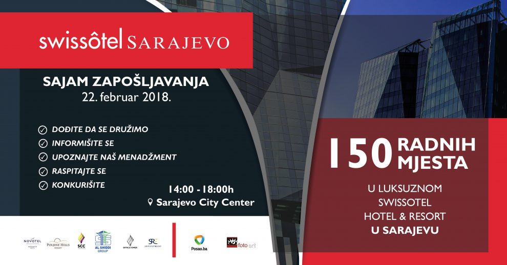 Kako bi zainteresiranim kandidatima, što više, približili mogućnosti zapošljavanja u Swissotel Hotel & Resort, predstavnici Agencije Posao.ba planiraju održati Sajam zapošljavanja – 22.02.2018. godine, u SCC-u Sarajevu. Svi kandidati koji su poslali svoje prijave za posao u Swissotel Hotel & Resort, kao i oni koji žele konkurisati, mogu doći na Sajam zapošljavanja i tokm prilikom se upoznati sa poslovima koje Agencija Posao.ba radi za Swissotel Hotel & Resort. Također, svi zainteresirani kandidati, ovom prilikom mogu saznati više pojedinosti o samom klijentu, uslovima zapošljavanja, predati svoj CV, te razgovarati sa uposlenicima hotela i informirati se o svim drugim detaljima u vezi pozicija na koje su se prijavili.