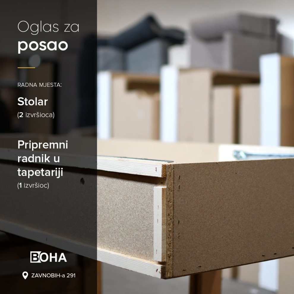 Na osnovu ukazane potrebe za dodatnim kadrom u odjelima stolarija i tapetarija, BOHA d.o.o. Zenica objavljuje oglas za popunu upražnjenih radnih mjesta: