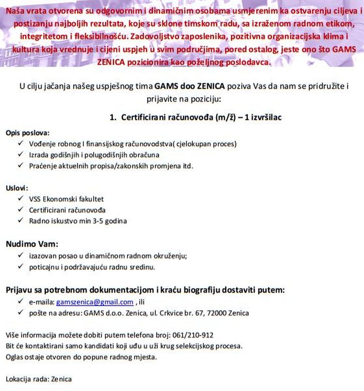 Posao: GAMS traži certificiranog računovođu – Prenosimo vam oglas za radna mjesta firme GAMS Zenica