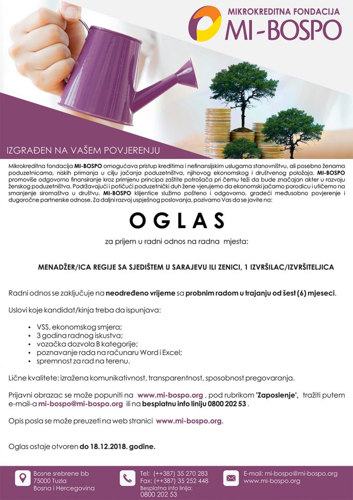 Mikrokreditna fondacija MI-BOSPO omogućava pristup kreditima i nefinansijskim uslugama stanovništvu, ali posebno ženama poduzetnicama, niskih primanja u cilju jačanja poduzetništva, njihovog ekonomskog i društvenog položaja.