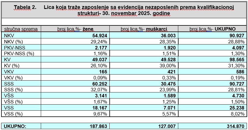 Podaci Agencije za rad i zapošljavanje Bosne i Hercegovine pokazuju da je u BiH krajem novembra 2025. godine na evidencijama zavoda i službi zapošljavanja bilo registrovano 314.870 nezaposlenih osoba, što predstavlja blago smanjenje u odnosu na prethodni mjesec.