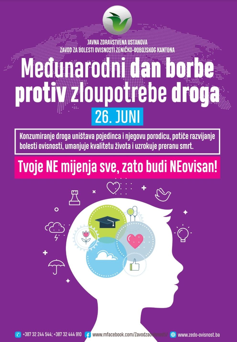 Javna zdravstvena ustanova Zavod za bolesti ovisnosti Zeničko-dobojskog kantona i ove godine obilježava ovaj značajan datum uz kampanju „Tvoje NE mijenja sve, zato budi NEovisan“ kroz koju će predstaviti različite preventivne i promotivne aktivnosti s ciljem podizanja svijesti šire populacije o štetnosti psihoaktivnih supstanci i rizičnih oblika ponašanja.