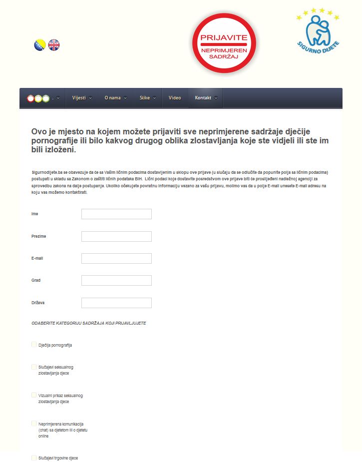Posjetite sajt Sigurnodijete.ba – online prijavite neprimjerene sadržaje – Međunarodni forum solidarnosti-EMMAUS poziva djecu, roditelje, nastavnike i javnost da posjete web sajt www.sigurnodijete.ba , te da prate ponovno aktivne Facebook i Twitter stranice Sigurno dijete, koje su uspostavljene s ciljem podizanja svijesti javnosti o rastućem globalnom problemu zloupotrebe informatičko-telekomunikacijskih tehnologija (ITK) s ciljem eksploatacije djece u svrhu izrade pornografskog materijala.